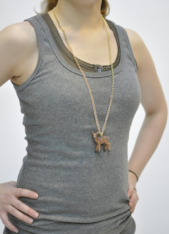 Utrolig søtt Bambismykke. Då dyret er av plastikk, festet i en "gull" lenke. Selve kjedet er ca 80-100cm.