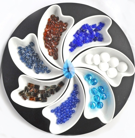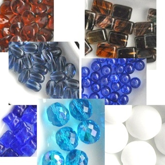 Et utvalg glassperler i turkis, blå, brun og hvit farge.
