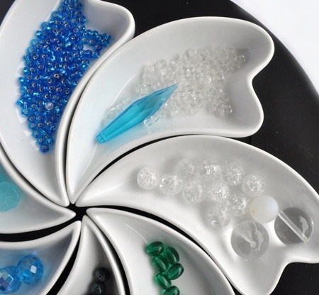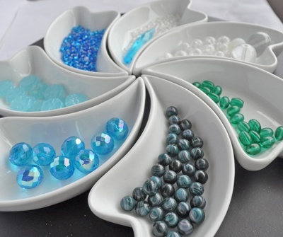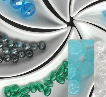 Et utvalg glassperler i turkis, transaprent og hvit farge.