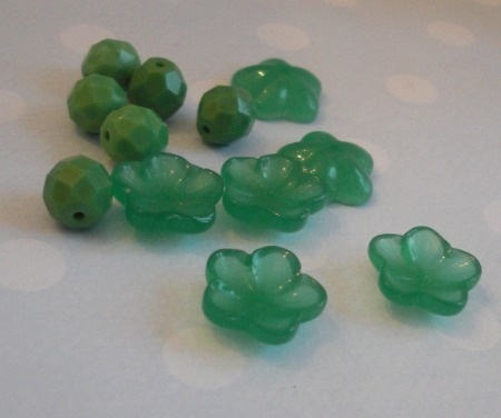 Denne pakken inneheld blomar og runde perler i grønt glas.Det er 6 blomar som er 13 mm i diameter og 6 runde som er 8 mm.