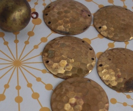 6 mellomdelar i metall som er hamra. 2,5 cm i diameter, med tre hol til perler el.anna.