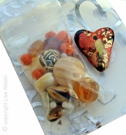 En organzapose med perler og en håndlaget porselensbit for deg som vil lage smykke, veske, jakke... det kan brukes til så mangt.