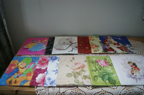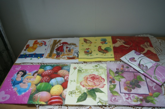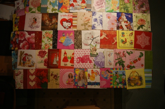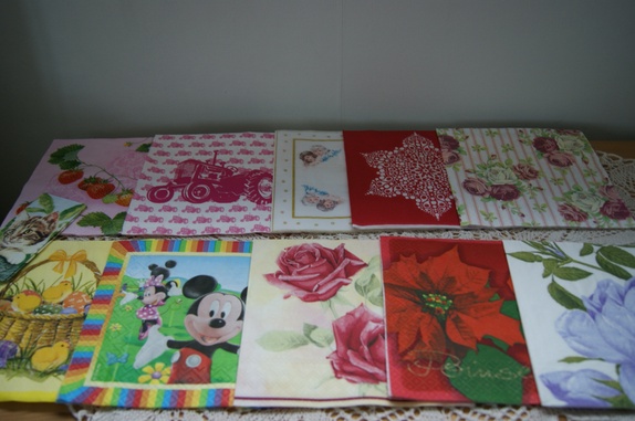 58 ulike servietter. Her er det jule, påske, barne, blomster og diverse andre servietter.
