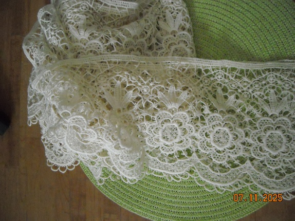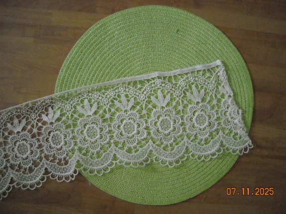 Denne flotte blonden er fra tidlig 60 tallet. Den er 20 cm bredDen satt på en gardin som ble kjøpt i Belgia.Den er rett oppe og har en tunge kant.Kremfarget.6,5 meter
