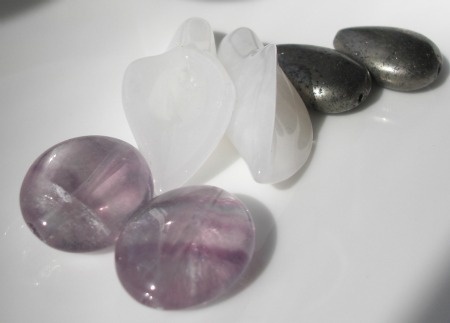 To fluorittperler med fint mønster, 2 cm i lengde. To pyritt dråpar som glitrar fint, 1,7 cm i lengde. To kvite kvartsperler som er forma som ein kala blome, lengde på desse er 3,5. Det er hol tvers gjennom.