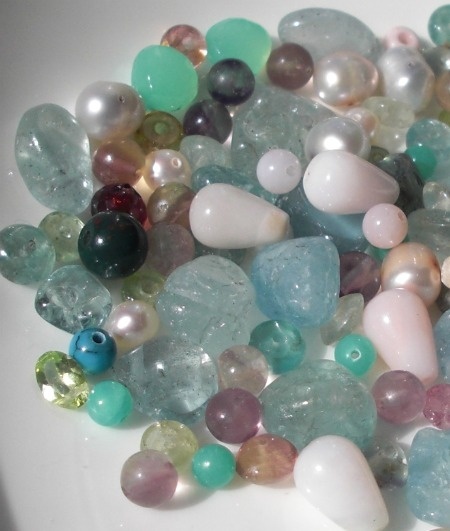 Her er det mange forskjellige perler, akvamarin i chips form, peruviansk opal dråper og runde perler, ferskvannsperler, turmalin, pyritt, krysopras, amasonitt, og turkis.... litt av kvart.