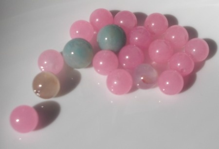 Amasonitt perlene er 1,2 cm medan jade perlene er 1 cm i diameter.