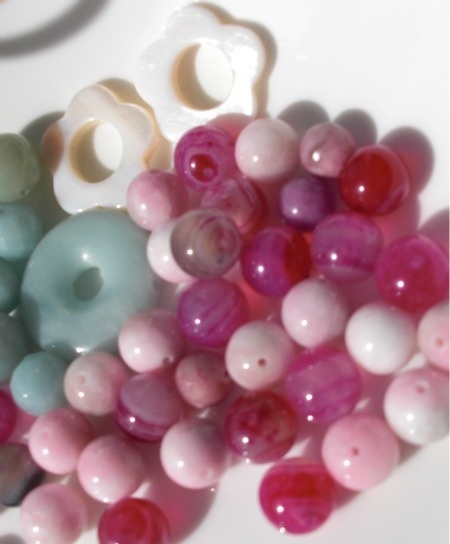 To perlemor blomar 2 cm.Amasonitt ring, 2,5 cm i lengde.Aventurin 1,2 cm.Jade (rosa og lilla) 8 mm.Amasonitt med fasettar 8 mm.Howlitt 1 cm.
