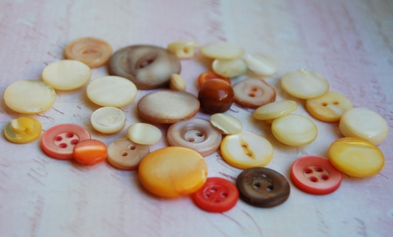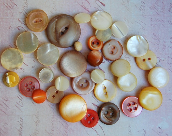 En samling gamle perlemorsknapper i ulike farger og størrelser.