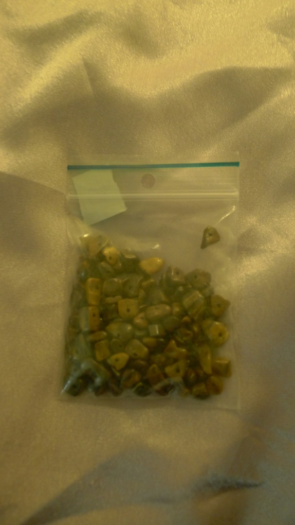 Polerte stener med uregelmessige former, ca. 10-20 mm. Med hull for tråd maks 1,5 mm i diam.
