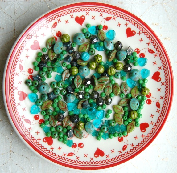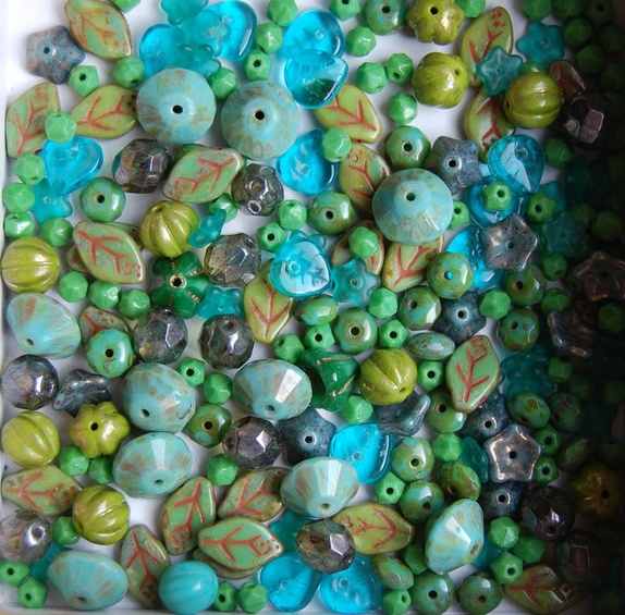 Grønne glassperler.Blader, blomster og faseterte tsjekkiske gla