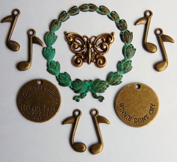 Smykkedeler i messing.Stor ring i verdigris patina ca 5 cm.Du får alt du ser på bildet.
