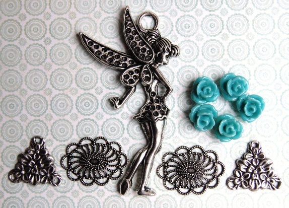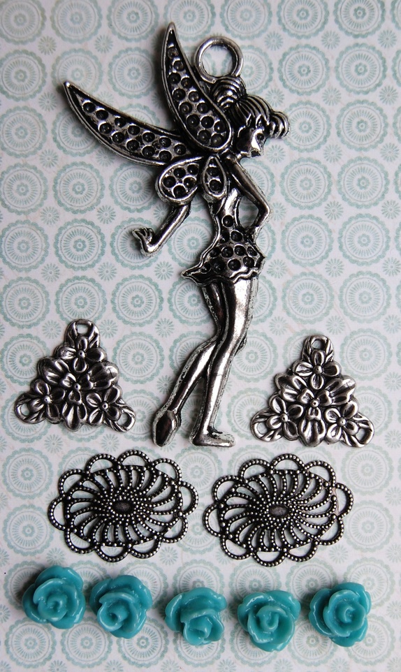 Tingeling, smykkedeler og lusiteblomster.Tingeling er 7.2 cm høy, Luciteblomstene har hull tvers over under og er ca 1 cm store.