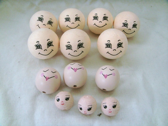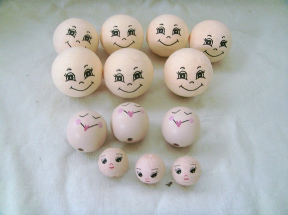 Det er 8 vatt hoder med ansikt,diameter 4 cm 3 stk trehoder med ansikt ,diameter 3 cm. 3 stk vatthoder med ansikt ,diameter 2 cm