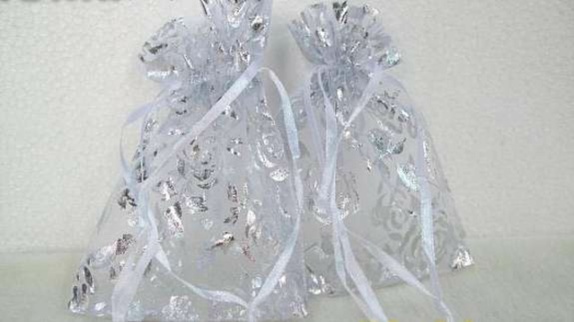 Flotte smykkeposer med rosemønster i organsa, med størrelse 9,5 x 13 cm selges.