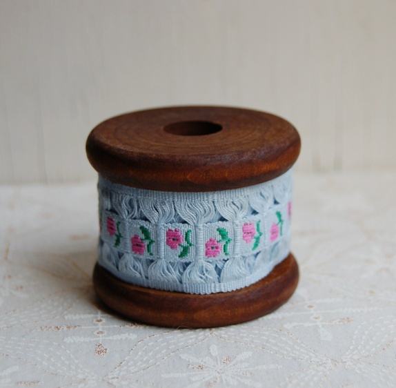 Lyseblått med rosa blomster vintage bånd på trespole.2.8 cm bredt og 93 cm langt.Snella er 4.5 cm høy.