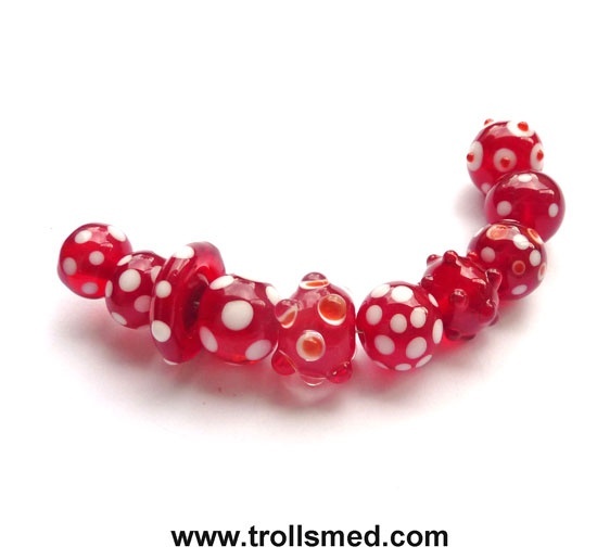 Trollsmeden lager selv både porselensperler og lampworkperler (perler som smeltes på åpen flamme av glass-stenger og formes mens glasset er mykt og seigt)
