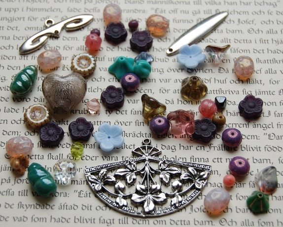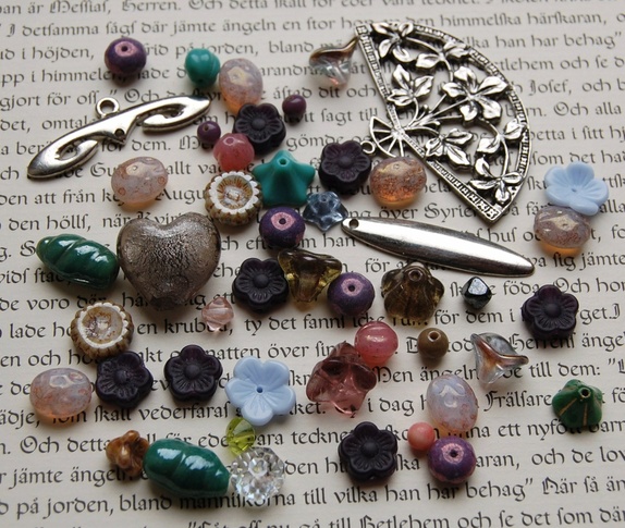 Tsjekkiske og indiske glassperler.Murano glasshjerte, vintage lyseblå glassperler m.m.Viften måler ca 3.5 * 5 cm