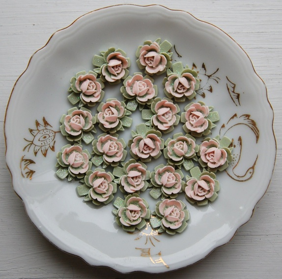 20 luciteblomsterTo farget med glitter, flat bakside for liming.Man kan borre hull i den også.Måler ca 1.6 * 1.8