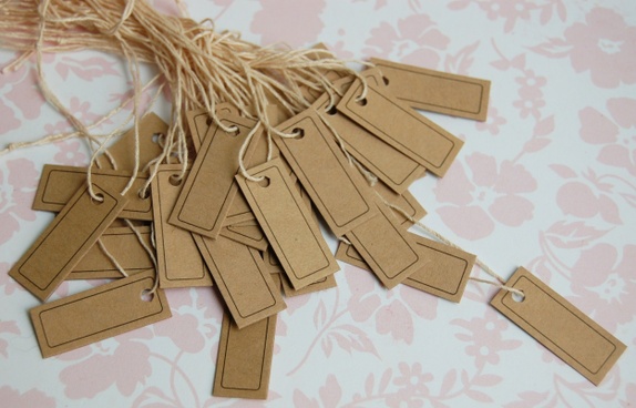 Små prislapper i kraftpapir med tynn hyssingsnor.2.5 * 1 cm14 stk