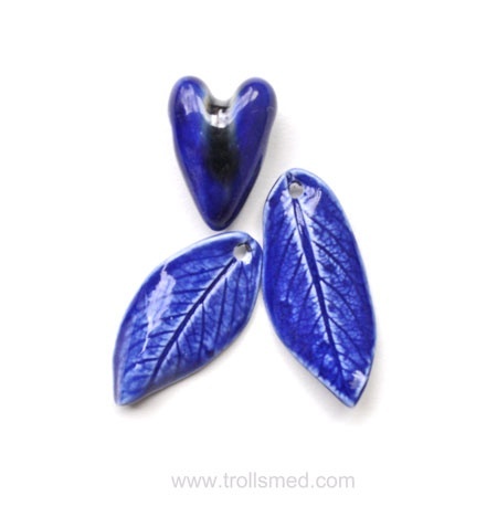 Håndlaget sett med to løv presset i porselen fra ekte blad, og et hjerte i blått og brunt, nydelig sett.