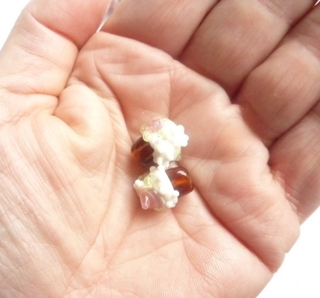 Håndlaget øredobbsett lampworkperler i glass. Nussebullesøte og rosa. Det er fint å sette en litt stor 3mm seedbead i hullet på toppen som en ekstra klatt.