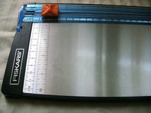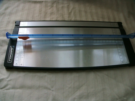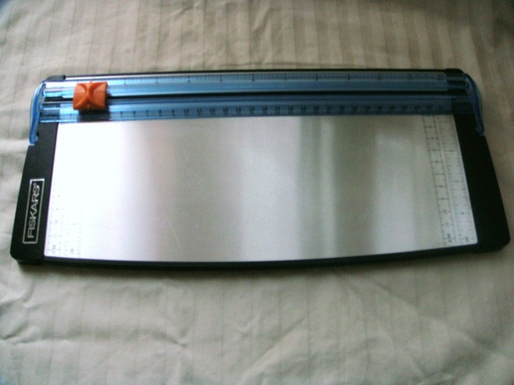 Fiskars skjæremaskin til papir,med på trykte hjelpelinjer og utsvingslinjal.Den har 30 cm skjæreflate.Målene er 16,5 x 36,5 cm.