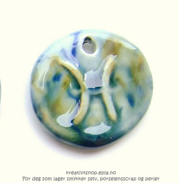Før 45Håndlaget porselensanheng, fiskene. Høybrent, ca 40mm.