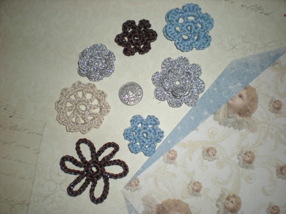 Heklede blomster, 7 stk pr pakke. Flotte til scrapbooking/kortlaging og til pynt på klær. Se str i forhold til kronestykke på bildet.