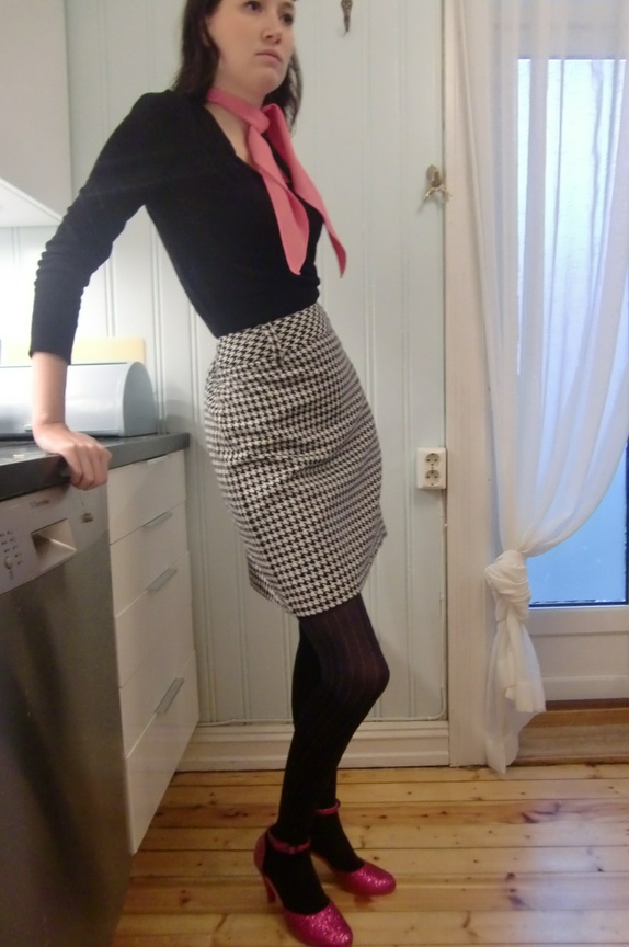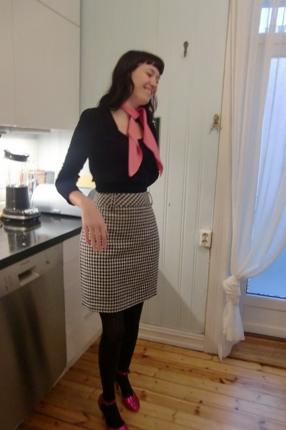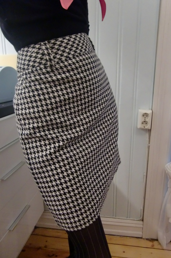 Skjørt i svart og hvitt, pepitaruterStr 40, 42 cm i livet, 50 cm langtSkjørtet er justert for å passe modellen