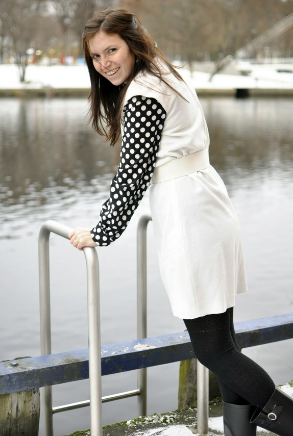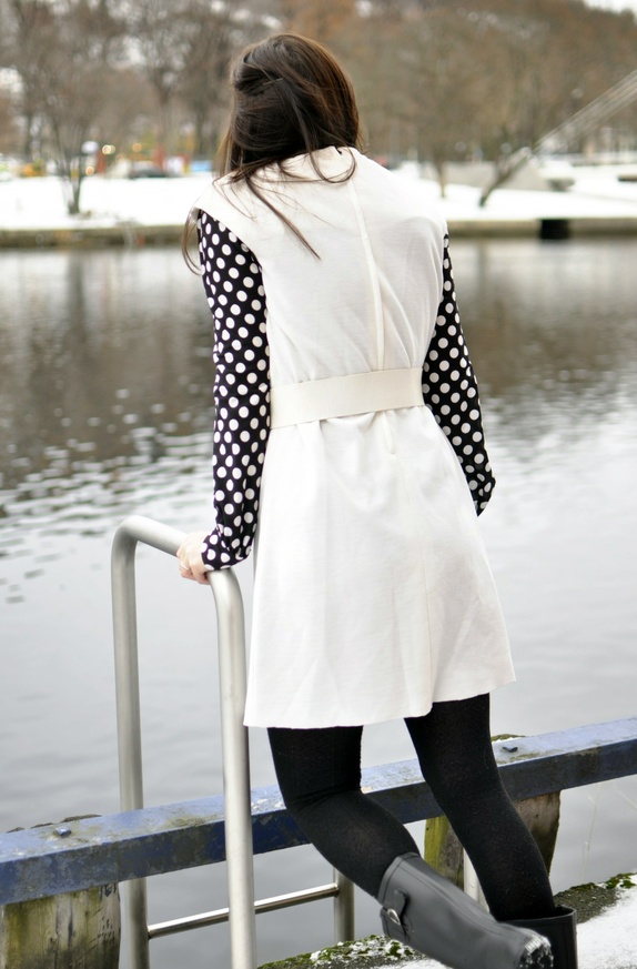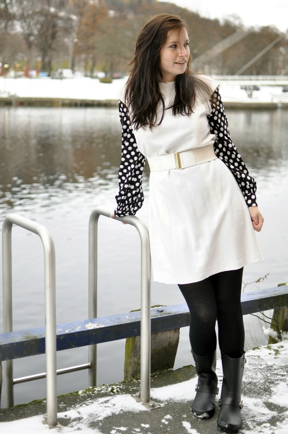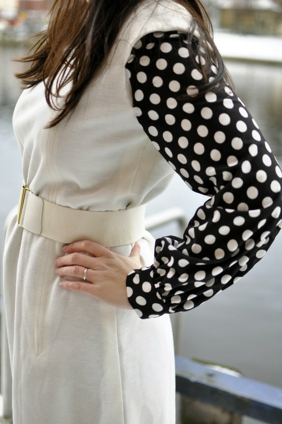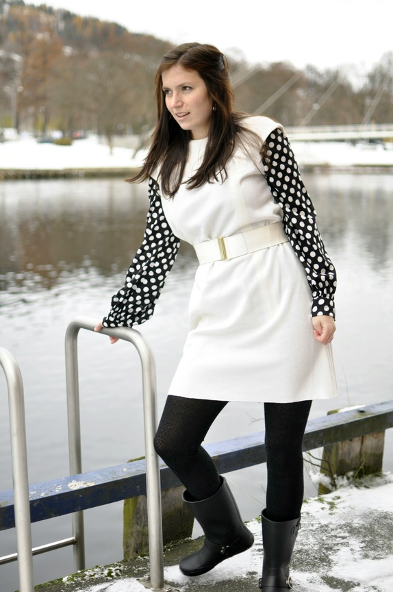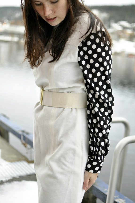Utrolig fin kjole fra rundt 60-tallet. Selve kjolen er hvit, mens armene består av armer i "løsere" stoff som er fylt med de søteste prikker!