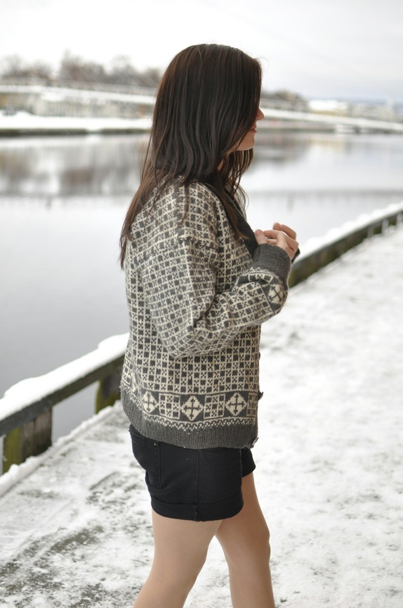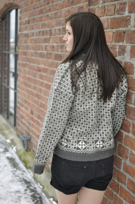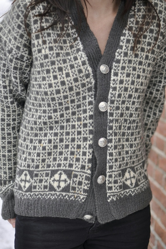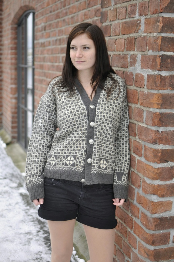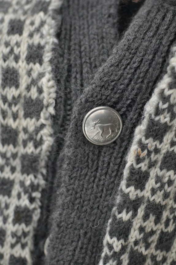 Kjempeflott strikkejakke, som jeg antar er hjemmestrikk. Kan ikke skjønne annet. Den er fint laget i flotte farger som grå og hvit. Knappene har de stolteste elger på seg.