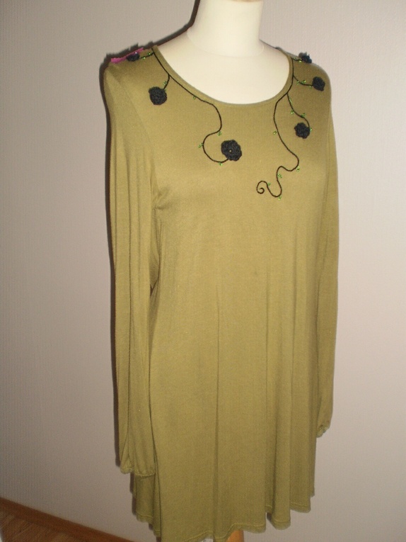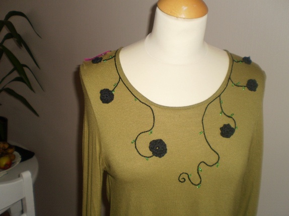 Gul/grønn topp med broderi, perler og heklede svarte blomster. Str M