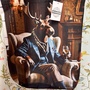 Totebag med unikt motiv på ene siden: Elg i dress, sittende i godstolen med et glass i hånden. :-) Baksiden og hankene er helsorte. Innsiden er hvit/beige og med en påsydd hengende lomme.