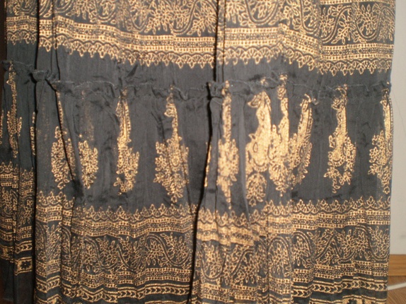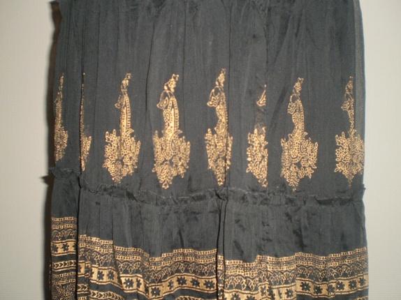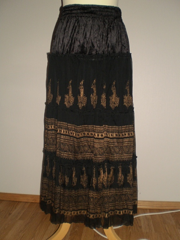 Langt sort skjørt med strikk i livet. Meget behagelig på.Mønster i gullaktig design.str 38/M