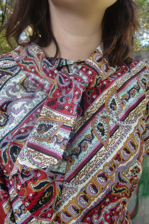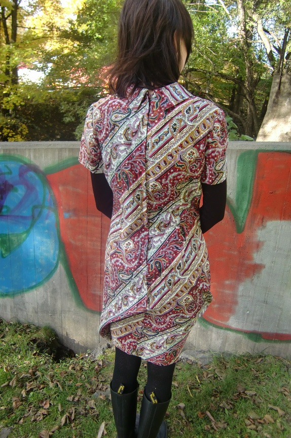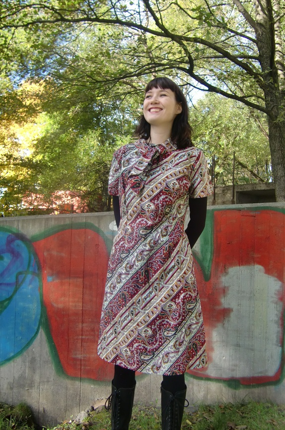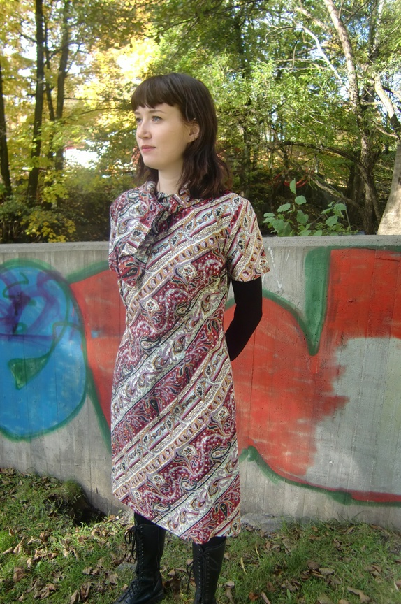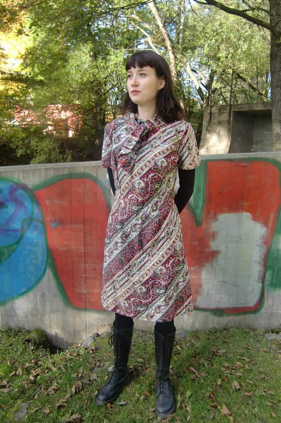 Vintage kjole i nydelige farger, ingen str oppgitt, men ca M42 cm fra skulder til skulder, innsvinget i midjen.glidelås bak