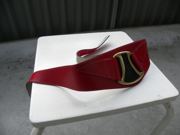 80-talls belte i skinn. Rødt med spenne i gull og svart,Sjeldent!Mål på 85cm, kan reguleres inn til 65 cm.