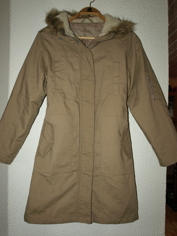 Beige, fôret parkas i lang modell. Knapt brukt, den har hette med pels og snøring i livet.Str 34/36