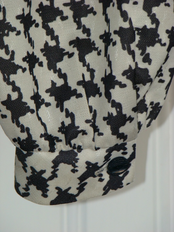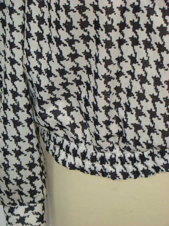 Svart og hvit bluse med søt knyting i halsen. Strikk nederst. Fine sorte knapper i halsen og på ermene. Usikkert hvilket stoff dette er, men det er "glatt". I fin skikk. Det står ikke hvem som har laget denne - den kan være hjemmesydd, men da isåfall av en svært flink syerske. Tipper den er fra 50- eller 60-tallet. Det er heller ingen størrelse i den, men den passer nok best en størrelse 36 ( også større størrelser, men den vil da være noe kort i armene).