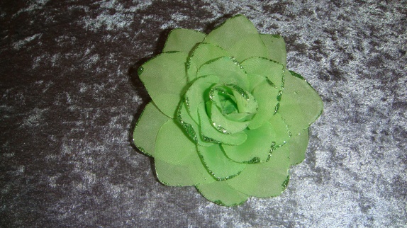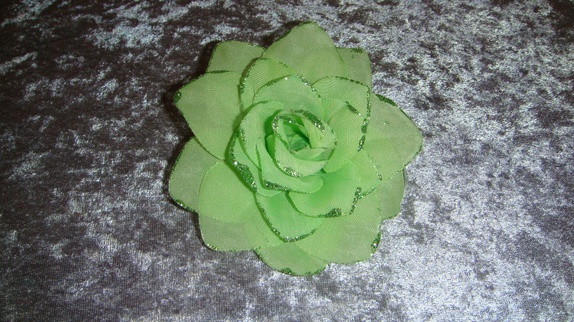 Rosen er 9,5 cm i diameter og har brosje nål bak.den har glitter langs kantene. ubrukt