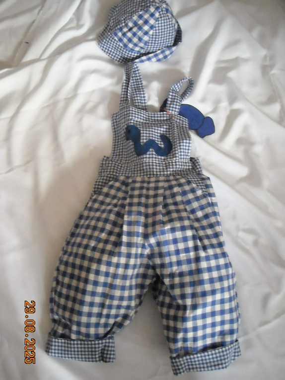 Snekkerbukse med hatt, sydd i 100% bomull.Små rutet lett sommerstoff med aplikasjon.Dette settet passer til et barn på 1-2 år .Bør vaskes på 40 grader.Førpris:250kr