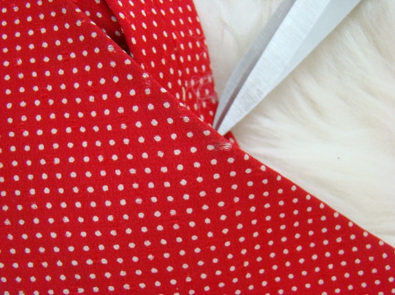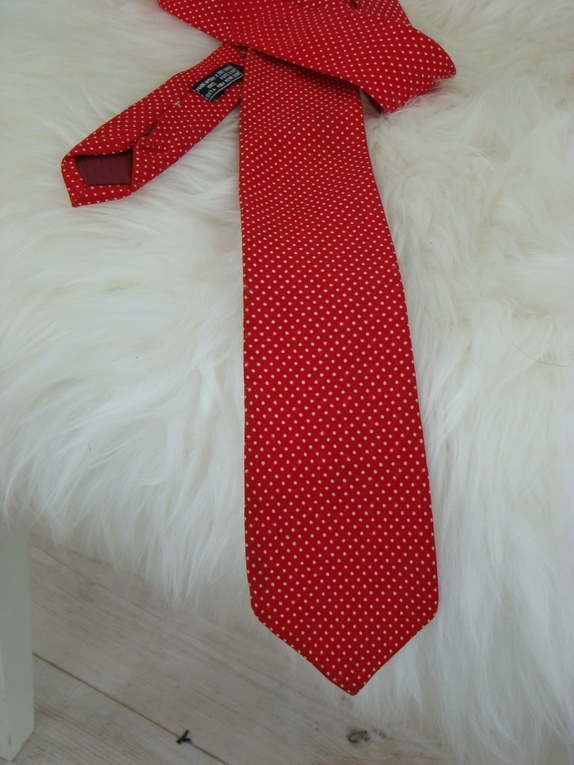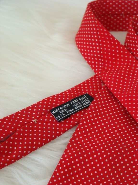 Vintage silkeslips i rødt med hvite prikker. Det er en liten ujevnhet i stoffet ( se indikering på bildet), men den vises ikke så godt.