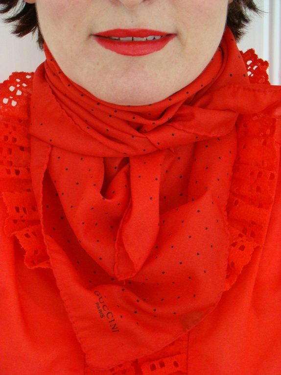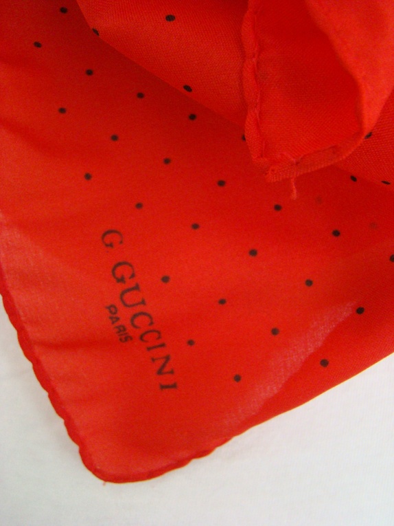 Rødt sjal med svarte prikker. "Guccini" Paris. Made in Italy. 77 cm x 77 cm. I svært fin stand.