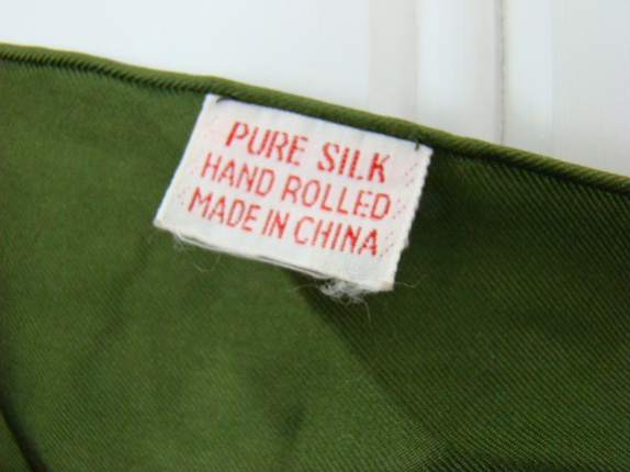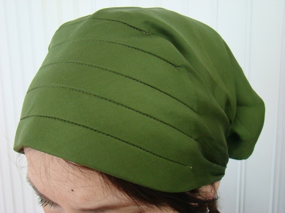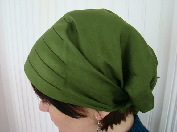 Sjal som er utformet til å bruke på hodet. Sjalet er sydd dobbelt og har "padding" framme på toppen. Olivengrønt. Ekte silke.