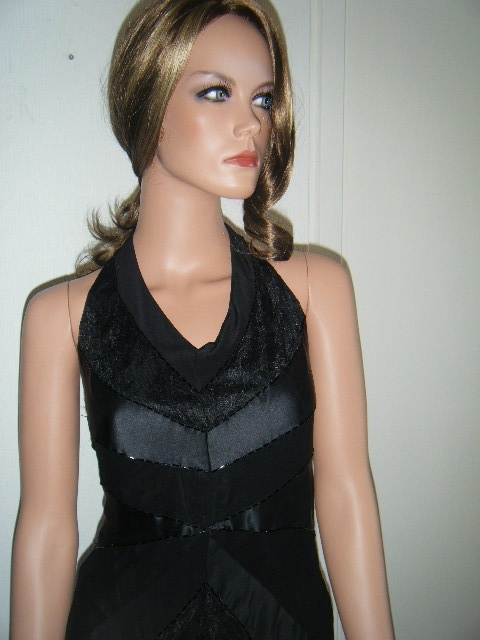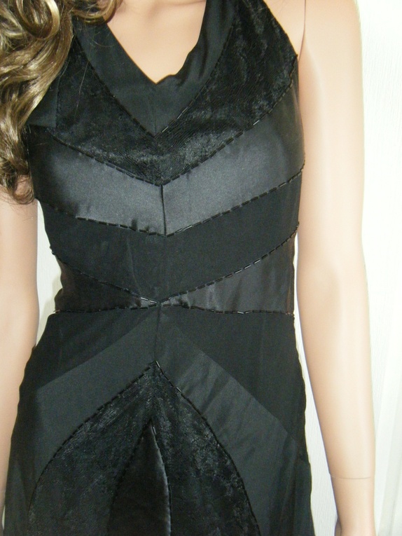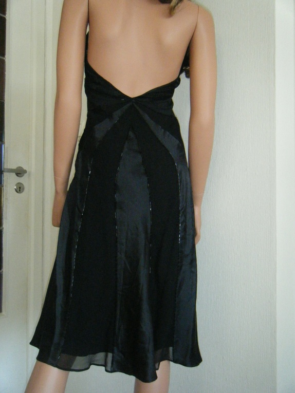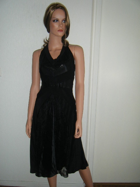 Flott kjole fra Oasis med innfelte blonde og silkefelter i sort, med perlerader langs overgangene. En pose med ekstra perler medfølger,da disse har en tendens til å løsne innimellom. Opprinnelig str 38,sydd inn til en str 36 hos skredder. Åpen rygg og knyting i nakken. Pent brukt.