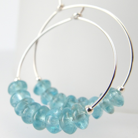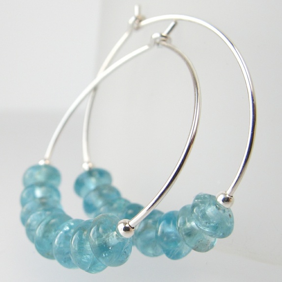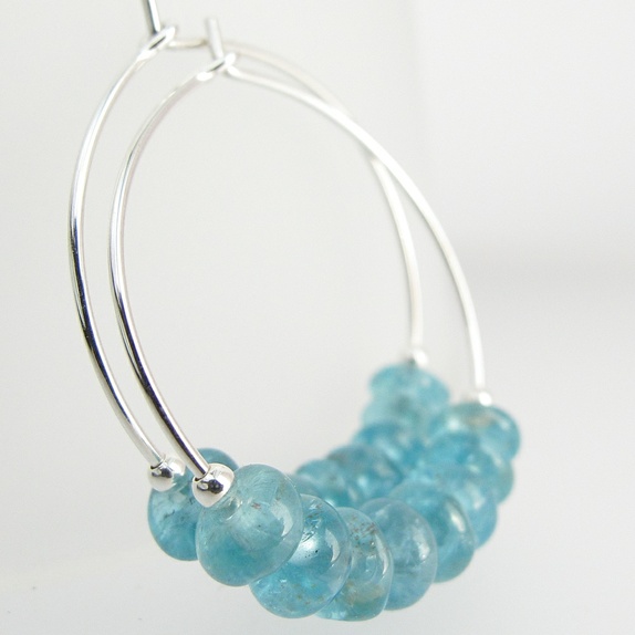 Glitrende mini-øreringer i sølv, med elektrisk blå apatitt-rondeller. Litt blågrønne egentlig. Ikke 100% klare, og de har en del naturlige ujevnheter og "spetter" som kommer veldig godt fram på bildene. Bildene er veldig forstørret, dette er små små stener, så du legger ikke så mye merke til det i virkeligheten... :-)