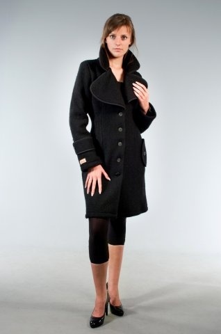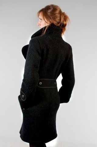 Kåpe i sort krafteig ull. Den er fasongsydd, har stor elegant krage og lommer i sidene. Kåpen lukkes med hornknapper.