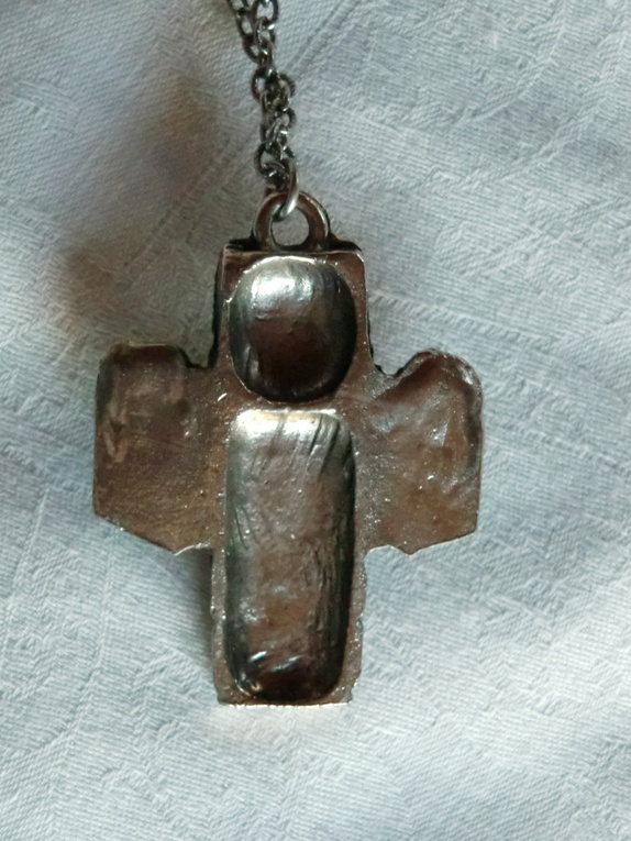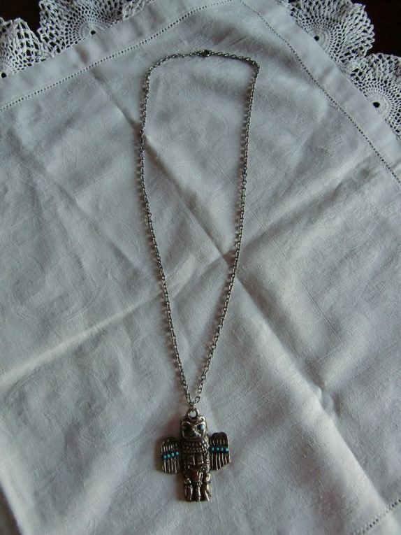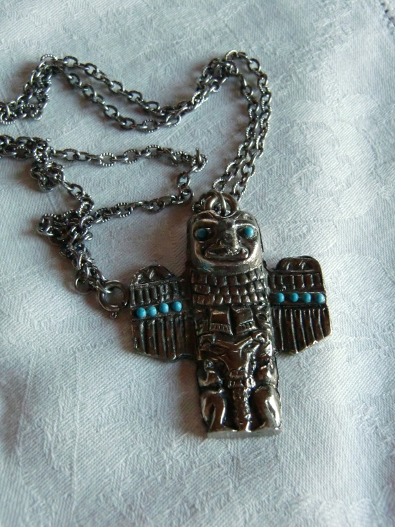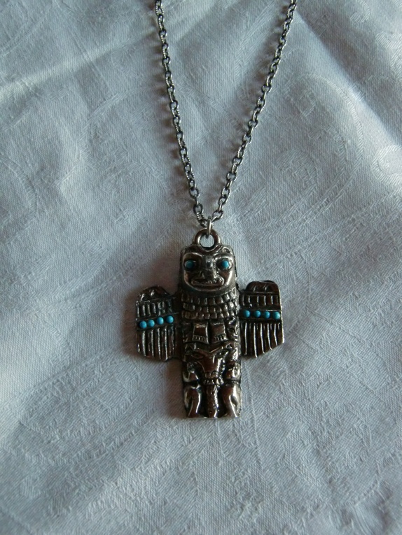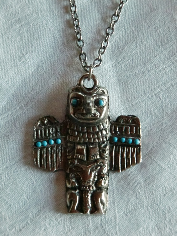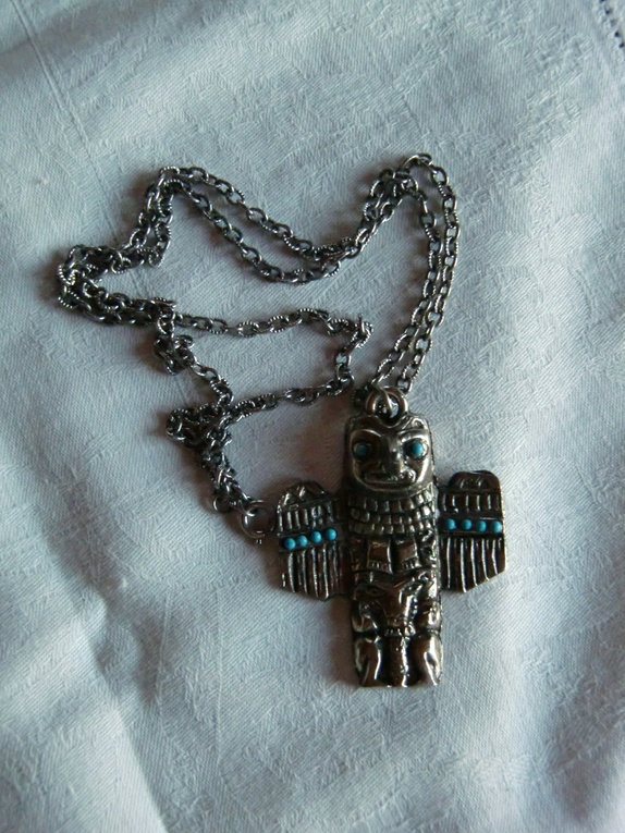 Retro smykke fra 80 tallet. Motivet kan minne om en inka/indianer figur. Har turkise små stener.