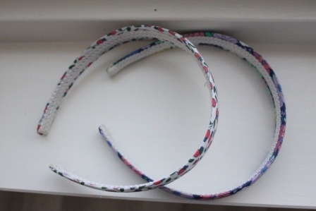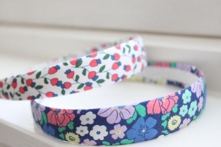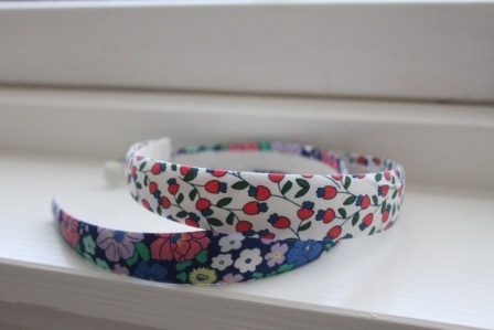2 søte hårbøyler med retromønster, en blå med blomster og en hvit med jordbær.