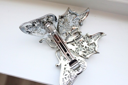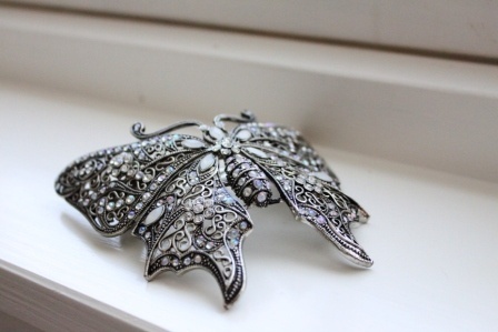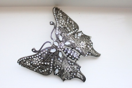 Stor sommerfuglhårspenne med blanke og hvite stener. Sølvfarget metall. Buet form, noe tung og passer best til voksne med litt tykt hår.